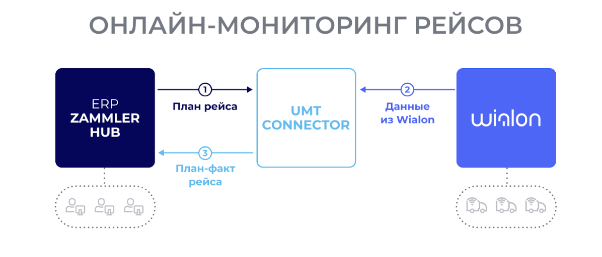 Сервис UMT Connector передает данные между ERP-системой компании и Wialon для онлайн-мониторинга рейсов